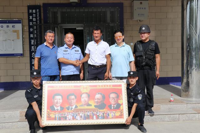 7月5日上午,居住在西尼尔镇巴西额孜村的新疆南疆籍流动人口阿布都外力·艾买提在西尼尔镇综治副书记及巴西额孜村书记、“访惠聚”工作组组长等人的陪同下,将自己妻子连日来制作的绣有毛泽东、邓小平、江泽民、胡锦涛、习近平五位历届领导人头像的钻石绣送到派出所。
