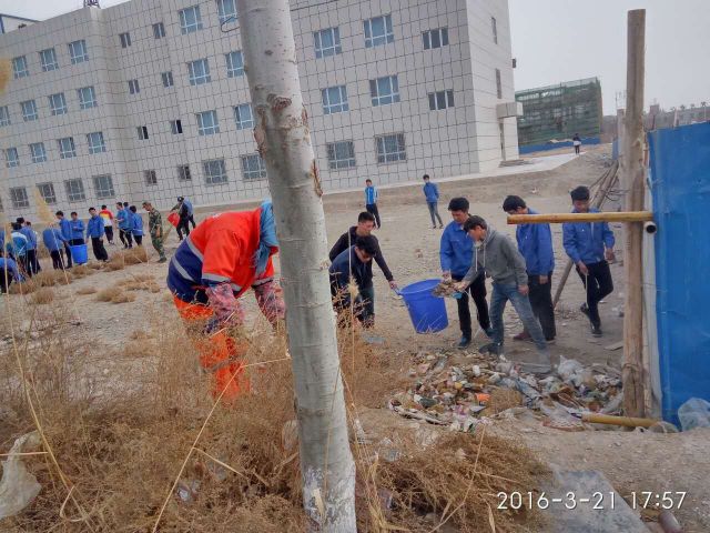 2016年3月21日下午,高洁公司安排5名环卫工人来到了巴音学院,巴音学院共出动学生35人。在双方共同努力下,最终将12号楼后的生活垃圾装入电动保洁车,并运至大型垃圾箱体内。此次共清理了三箱垃圾,总计4.5吨。